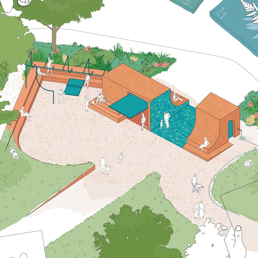 Our Green Pavilion proposes a new entrance to the Lambeth Garden Museum and a place for the local community to gather, play, contemplate, and seclude themselves in the landscape of the museum gardens. The terracotta clad pavilion is sunken to create a barrier to the road. It provides playful seating and infrastructure, suggesting a variety of uses for the community to inhabit.