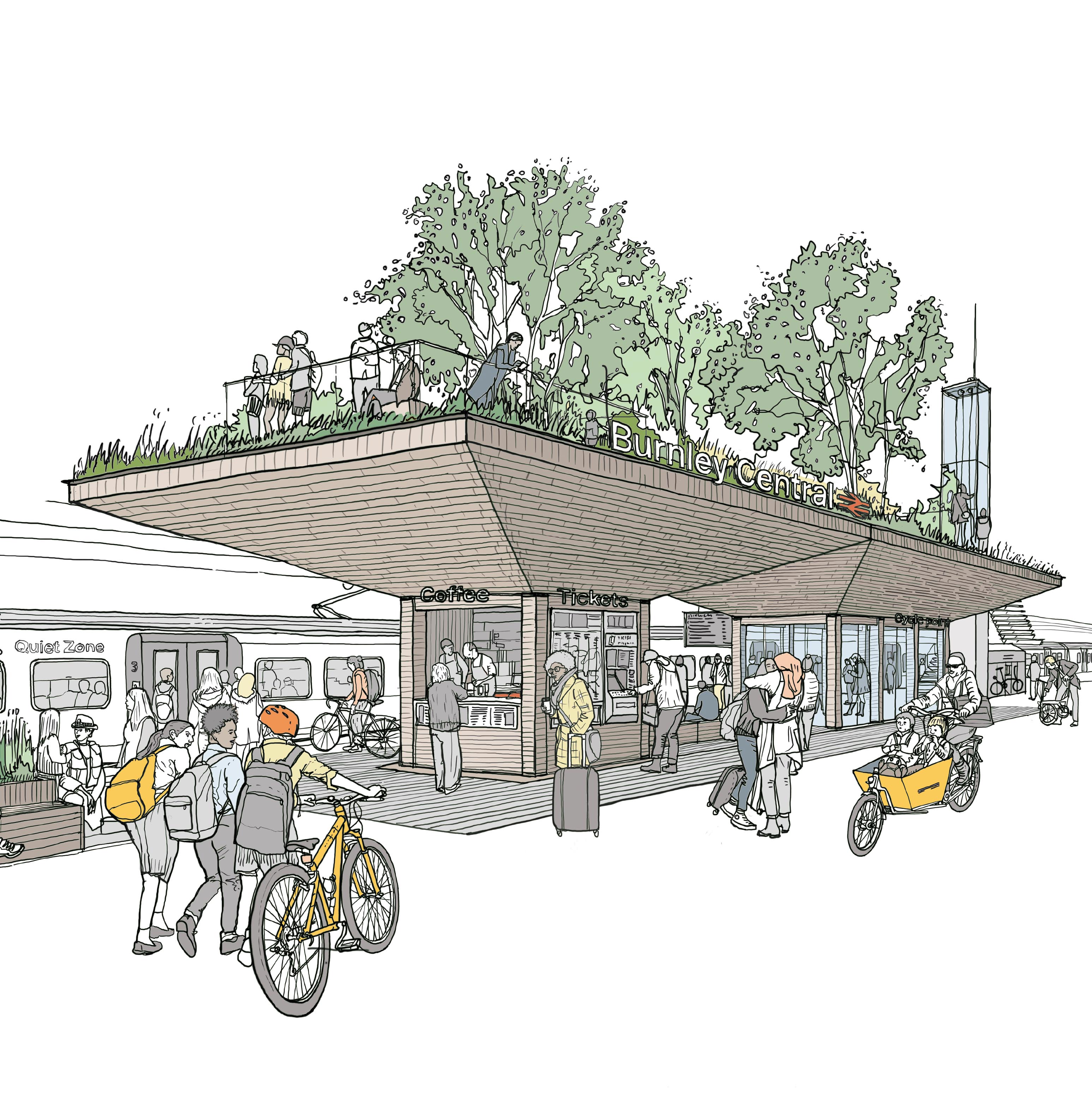 A modular canopy that can be scaled to fit different sizes of railway stations is proposed, creating two distinct, connected environments. Above the canopy, people will enjoy the wildness of a lush, wooded landscape open to the elements, with a community-powered garden. Below, the undercanopy will help passengers, workers and local communities use the station in ways they need while capturing data to optimise the space across the rail community.