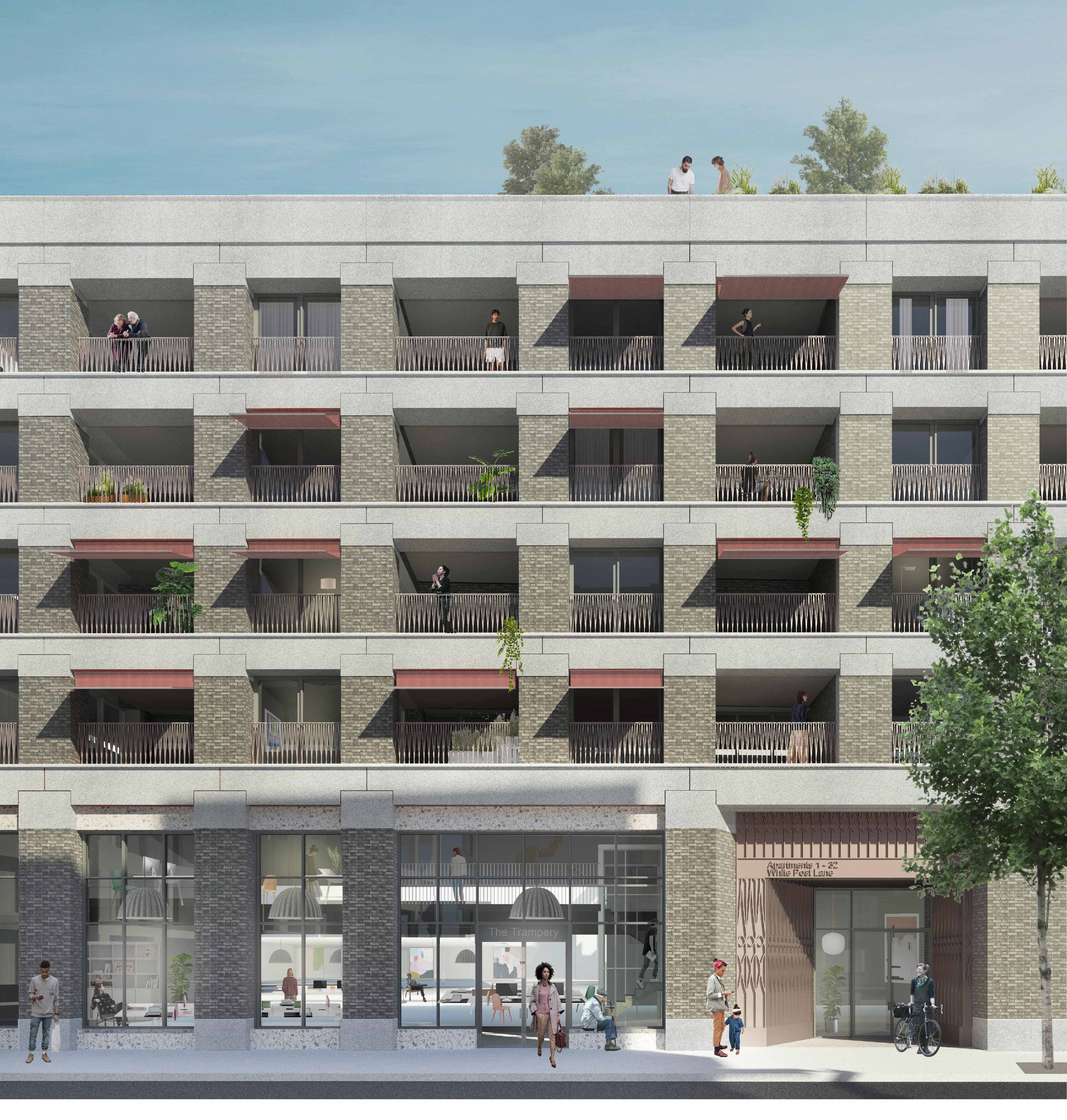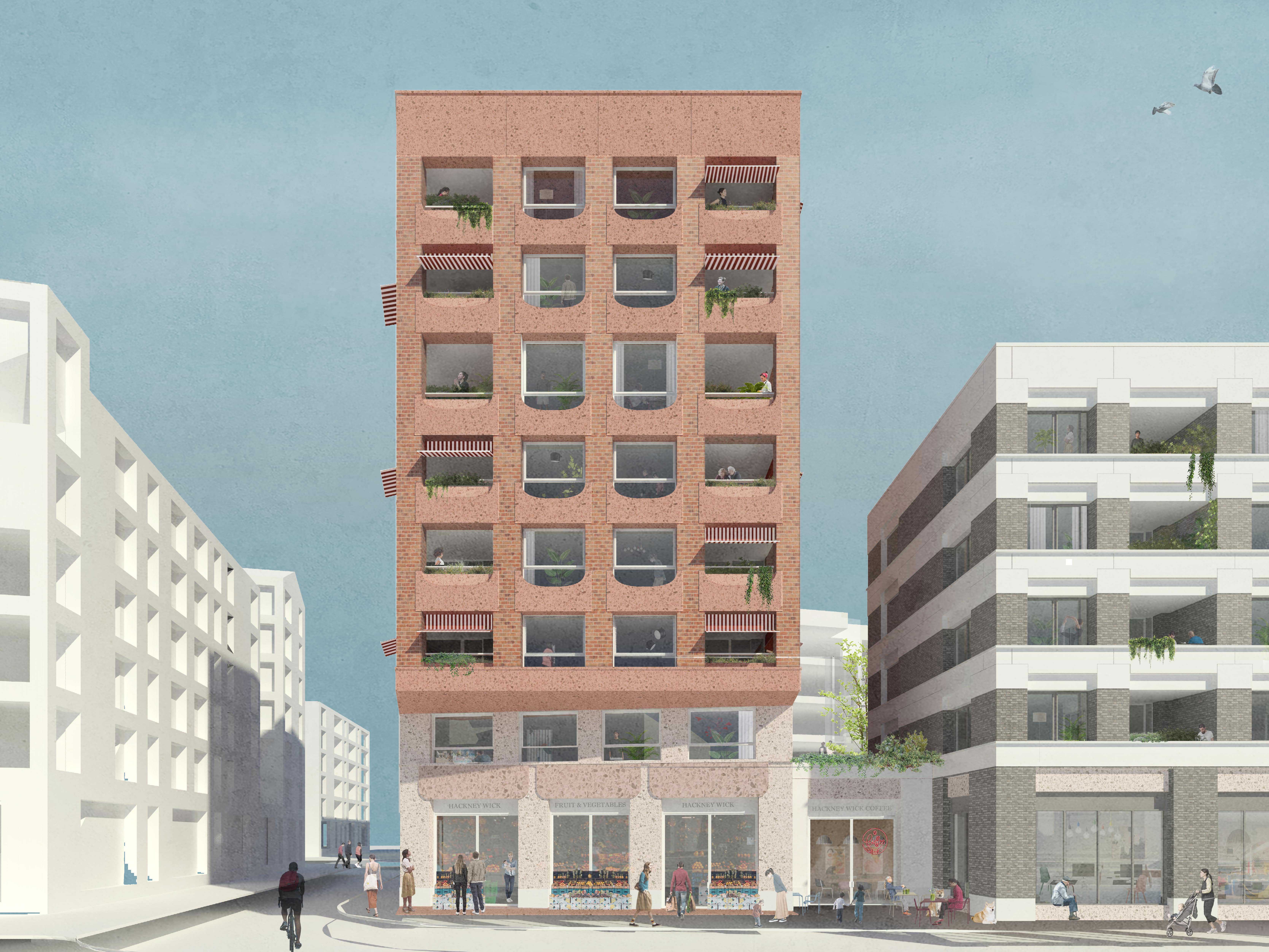 Our design reflects Hackney Wick's spirit of joy, eccentricity, experimentation and innovation, with playful moments in its materiality and detail. A new 8-storey tower acts as a marker for the neighbourhood centre, with playful openings that invert the window arches of nearby warehouses. Residential entrances, retail and workspace are located on main routes, creating active and lively ground floor frontages onto the historic streets. Entrances are special moments in the elevational treatment and an opportunity to showcase the heritage and craft of Hackney Wick’s local designers and makers. Brick is the predominant façade material with accents in durable, well-crafted secondary materials, including brick fragments cast in lintels, and terrazzo, which allows possibilities for recycled aggregates such as glass, stone and marble. Planters are integrated into the facade design to encourage growing on balconies, and the urban greening of a centre, where biodiversity is currently lacking. The public realm provides additional opportunties for urban greening through a new pocket park, alongside new intergenerational play spaces and community curated art spaces, contributing towards a healthier, more inclusive and sustainable piece of the city.